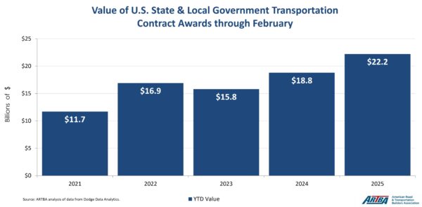 What happened: The total value of state and local government highway and bridge contract awards was $22.2 billion through February 2025, up from $18.8 billion through February 2024, according to just-released data from ARTBA’s economics team. Data for the first quarter varies significantly and is dependent on a variety of factors, including weather and state transportation programs. Highlights include: