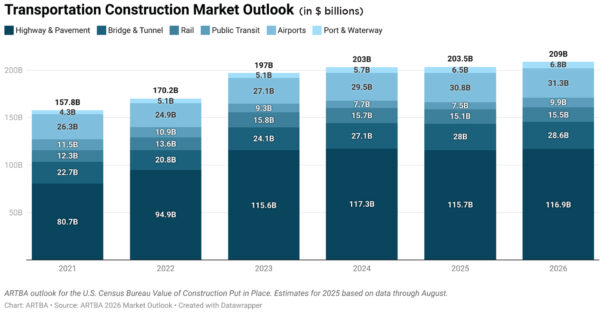 What’s happening: The U.S. transportation construction market is expected to grow nearly three percent to a record $209.1 billion in 2026, according to ARTBA’s newly released market outlook.