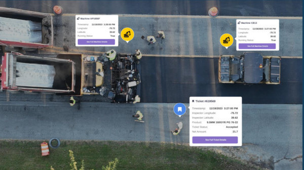 Additionally, DOT inspectors and contractors were provided with real-time digital insights of the flow of equipment and materials across the project. Aerial drone footage (see photo above) captured the synchronization of pavers, rollers, and inbound material loads as the data was flowing to project stakeholders, illustrating the system’s ability to provide a comprehensive, holistic data-driven perspective of the jobsite and start the process to create on demand digital as-builts used by both the DOT and contractor.