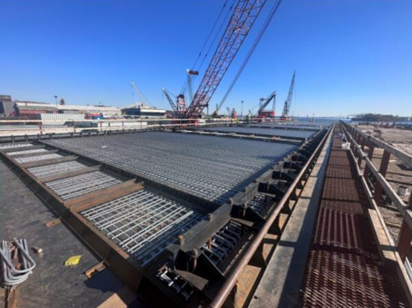 Pictured above: Pre-cast steel and concrete panels fabricated off-site are delivered via barges and set on the bridge deck. Photo courtesy of Kokosing.