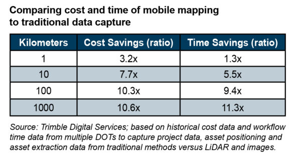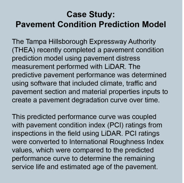 LiDAR surveys, which include pavement scans—supplemented with high-resolution photos and analyzed using artificial intelligence—can now be performed to provide quantitative metrics on pavement damage and wear with increased efficiency. The ability to perform these scans on a recurring basis allows damage analysis and projections at a scale and granularity that was not feasible even a few years ago. This may lead to a significant decrease in overall costs for hardware by leveraging mobile mapping, as compared to the cost and time required for traditional data capture.