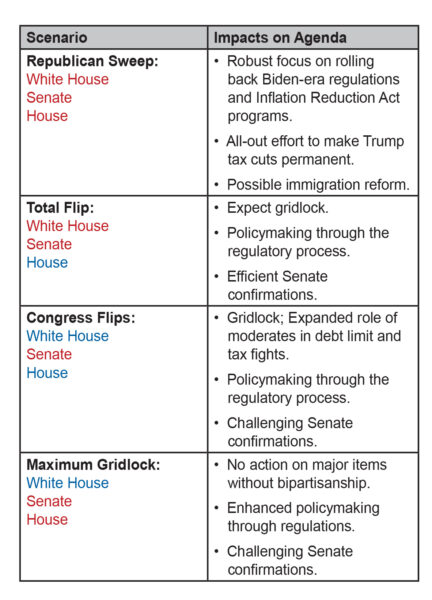 The chart below examines how the four most likely scenarios may shift the agenda in Washington.