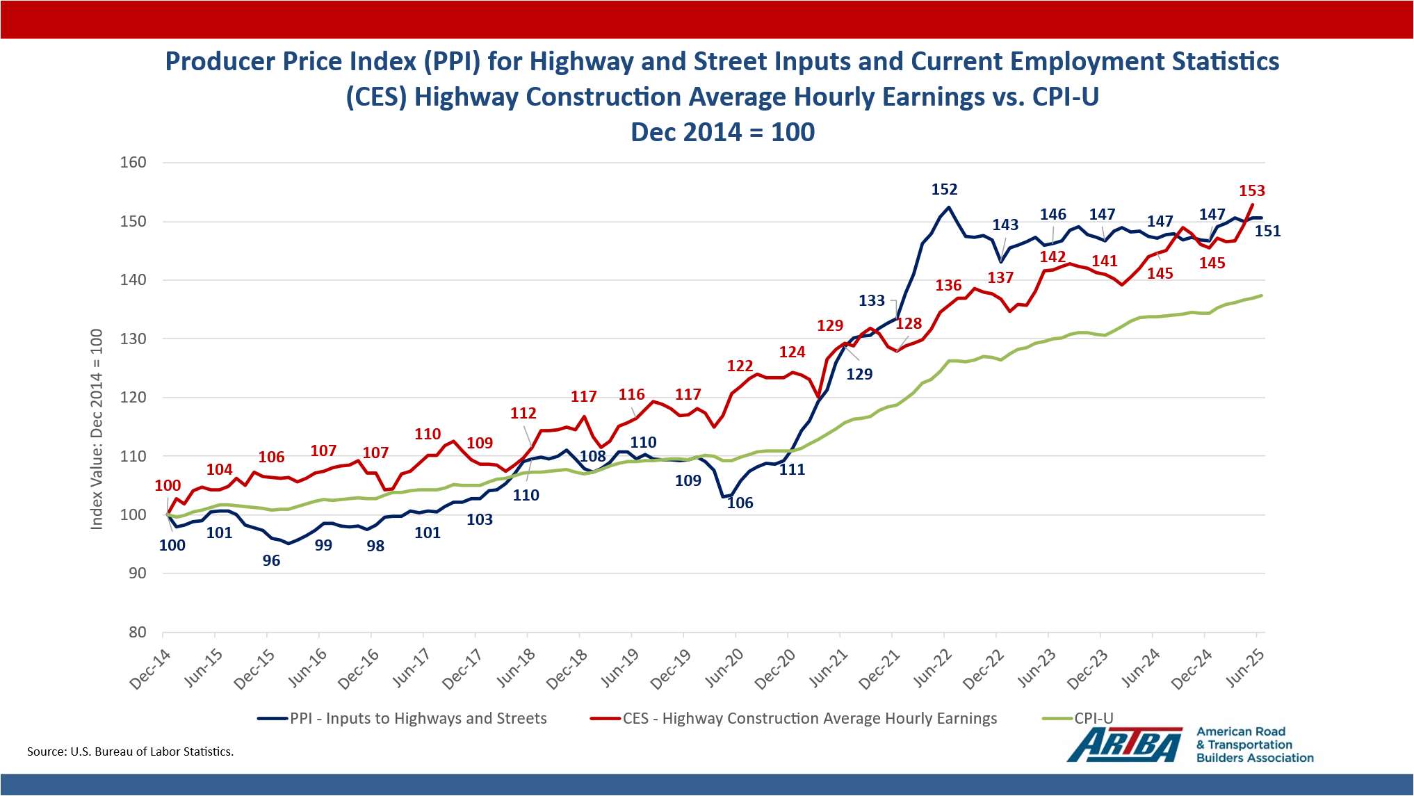 Meanwhile, as evidenced in the chart below, labor and materials costs increase over time, in turn increasing the estimated cost of a project. These cost increases constrain states’ ability to maximize investment of taxpayer dollars and ultimately result in fewer improvements to communities.